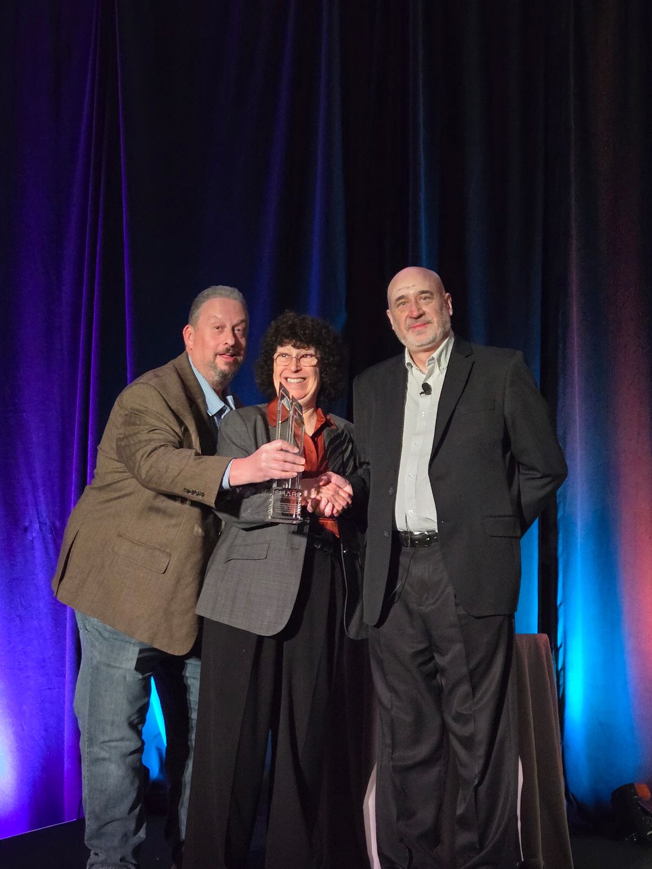 BMC’s Anthony Anter and award recipient Sun Coast’s Janet Sun, both from SHARE’d Intelligence’s Editorial Advisory Committee, with SHARE President Art Gutowski