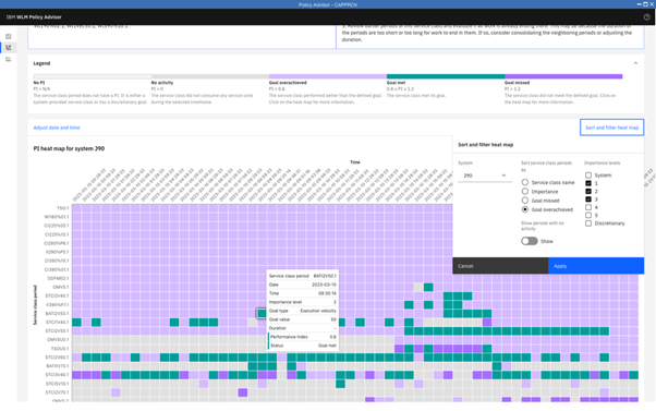 WLM Policy Advisor supports analyzing service classes by providing a heatmap, along with filtering and sorting options. Below we can see that many service classes defined in the policy are not meeting their goals. This serves as an indicator for a more detailed analysis and policy adjustment.